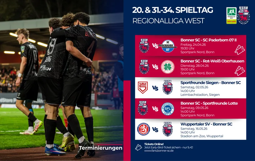 Gerade die Heimspiele könnten in dieser Phase eine entscheidende Rolle spielen – und dabei setzt der Bonner SC einmal mehr auf die Unterstützung seiner Fans. Der Ticketverkauf für die Partien gegen Oberhausen und Paderborn ist bereits gestartet. Für das letzte Heimspiel der Saison wird der Vorverkaufsstart in Kürze bekanntgegeben.
